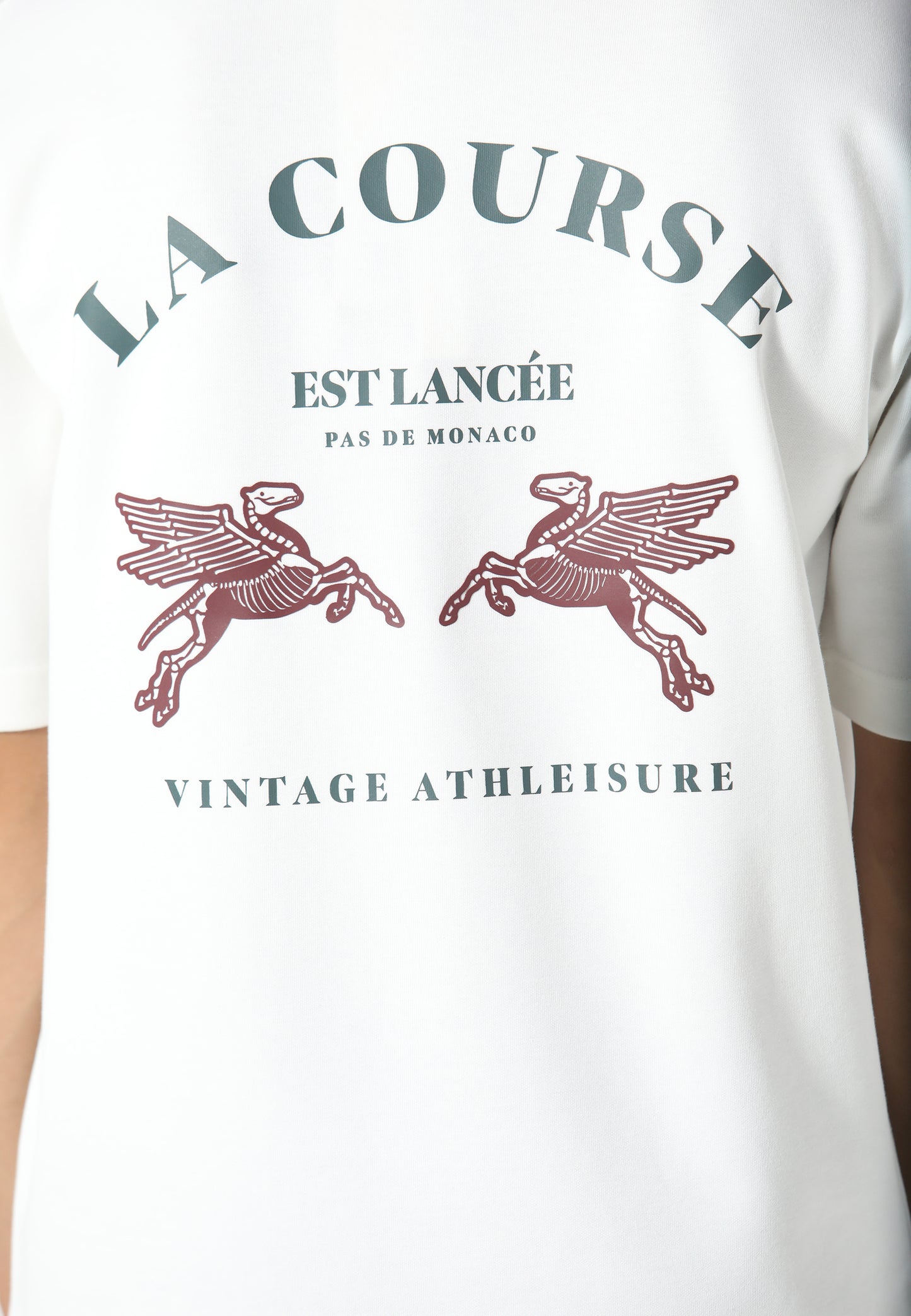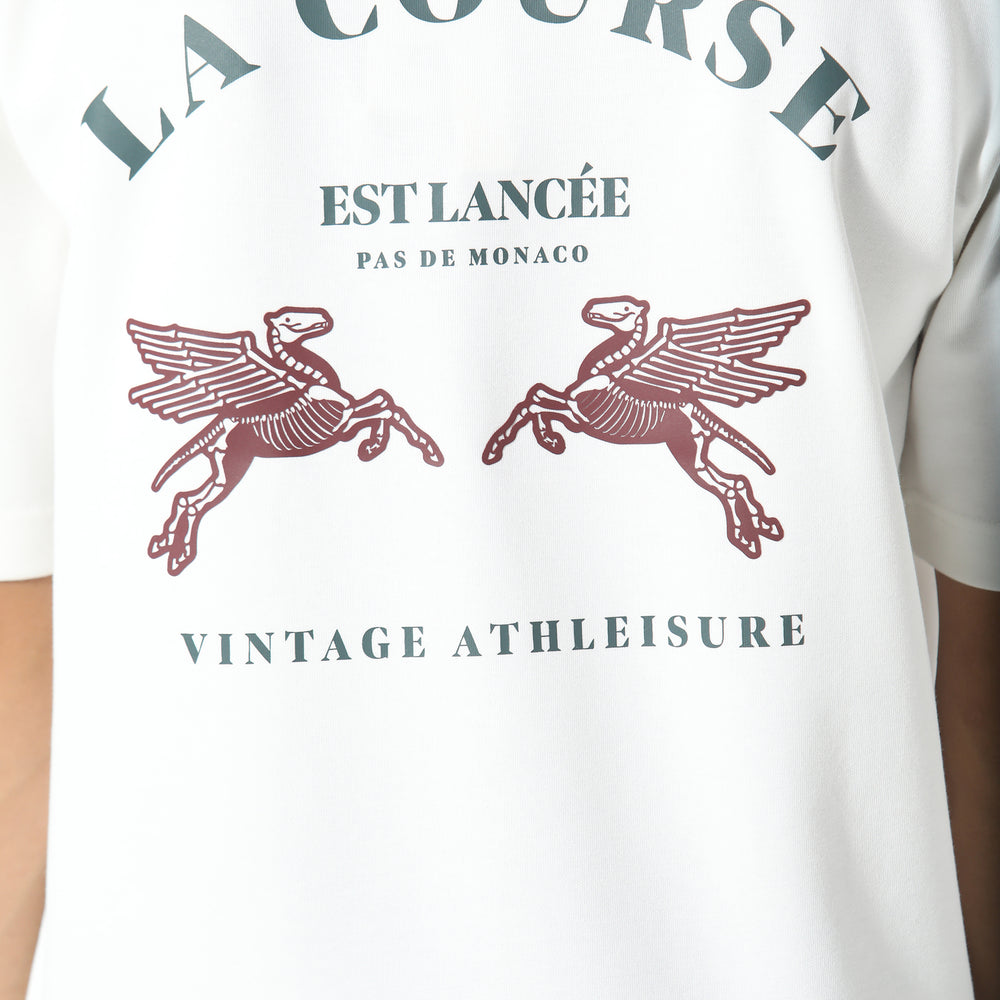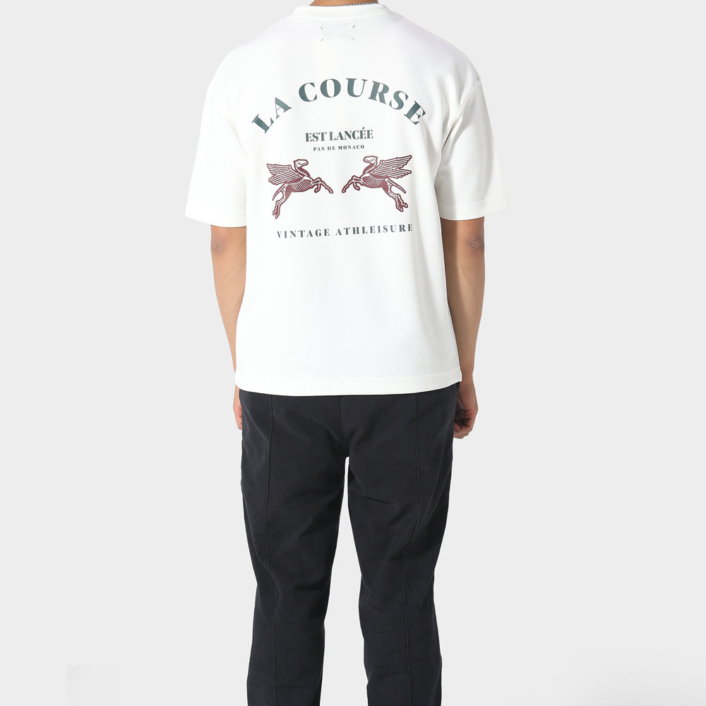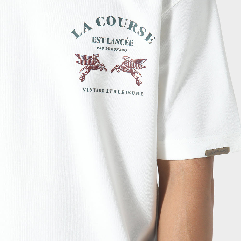 Crafted from premium 240 GSM interlock cotton, the Le Course T-Shirt blends vintage athleisure with modern construction. Featuring signature Pegasus graphics on the front and back, rendered in a mix of screen and high-definition (HD) prints, it captures a sense of motion and mythology. Finished with our signature metal sleeve branding.