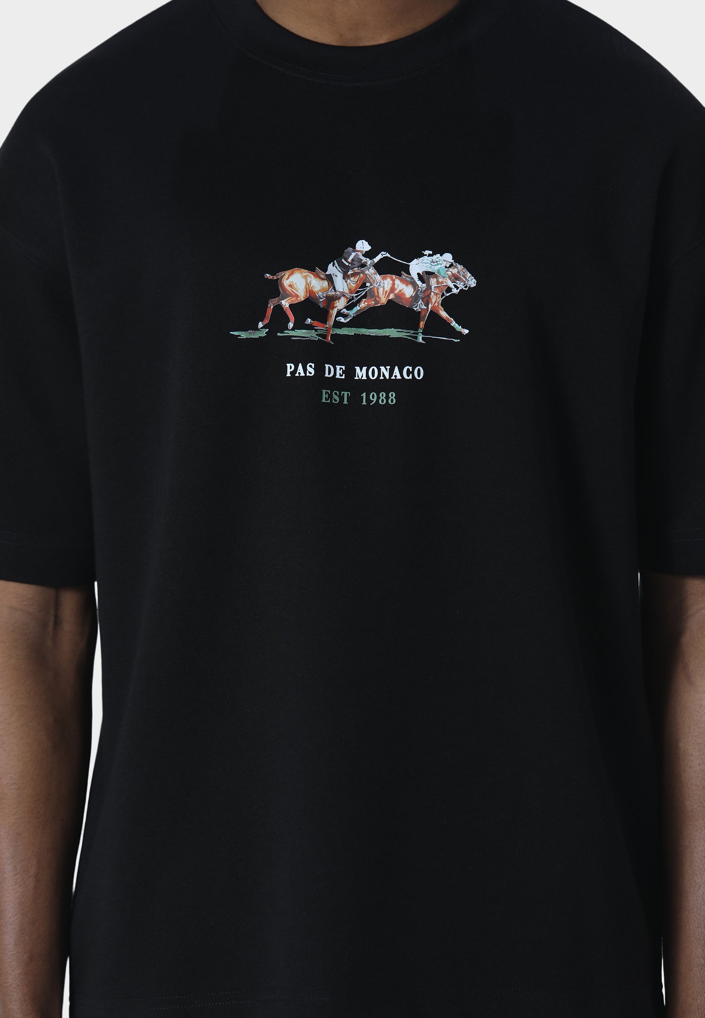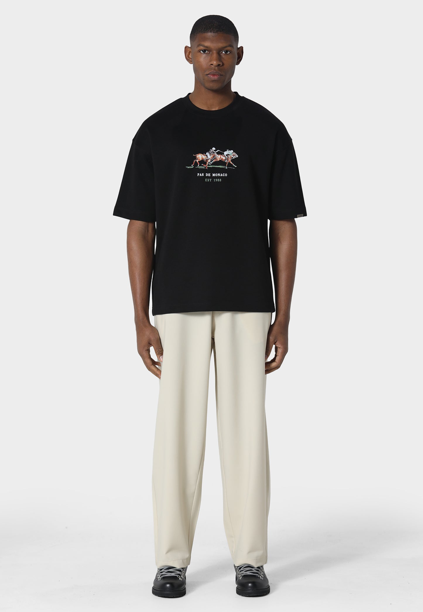 A refined take on statement graphics, the Equestrian Flare T-Shirt is crafted from 240 GSM interlock fabric in a relaxed oversized fit for structure and comfort. The front features a detailed equestrian-inspired DTF print, bringing movement and character to the minimalist silhouette. Finished with Pas De Monaco’s signature metal sleeve badge detail.