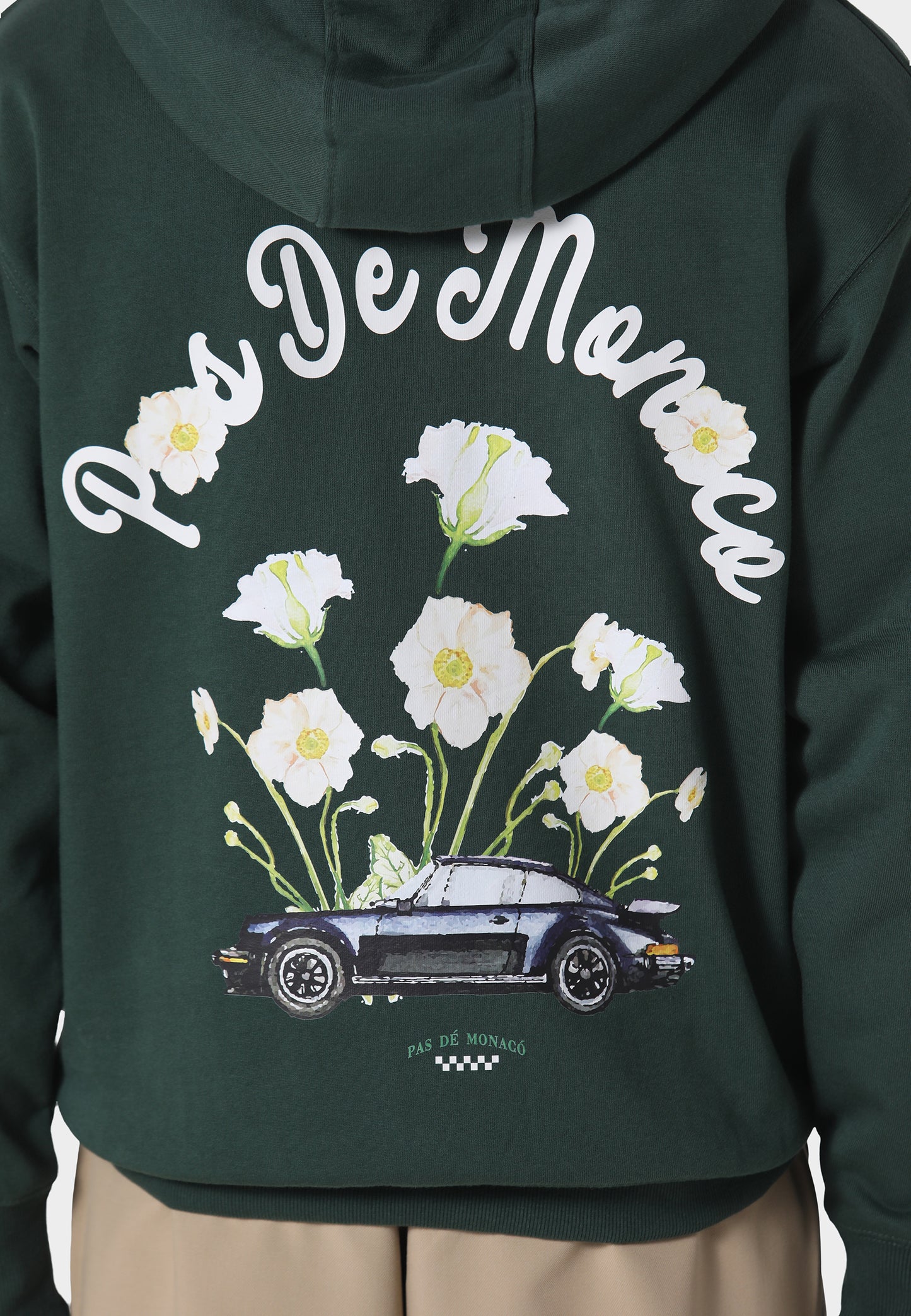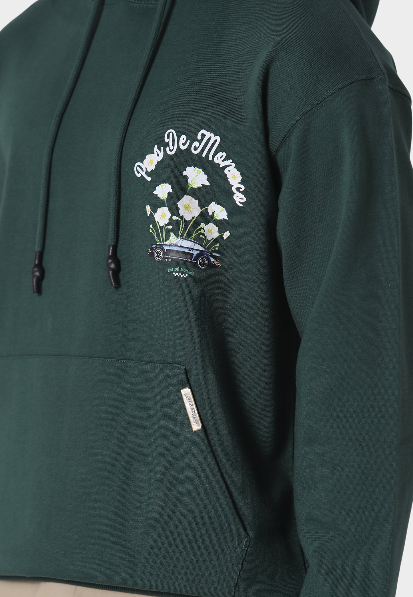 A refined blend of classic automotive inspiration and contemporary streetwear, the Fleur De Route Pedosa Green Hoodie is crafted from heavyweight 450 GSM loopback cotton for a structured yet comfortable feel. Designed in a relaxed fit, it features a screen-printed chest graphic and a large back print combining floral elements with a vintage car motif, creating a distinctive statement. Finished with a drawstring hood, kangaroo pocket, and Pas De Monaco’s signature metal pocket badge for a premium touch.