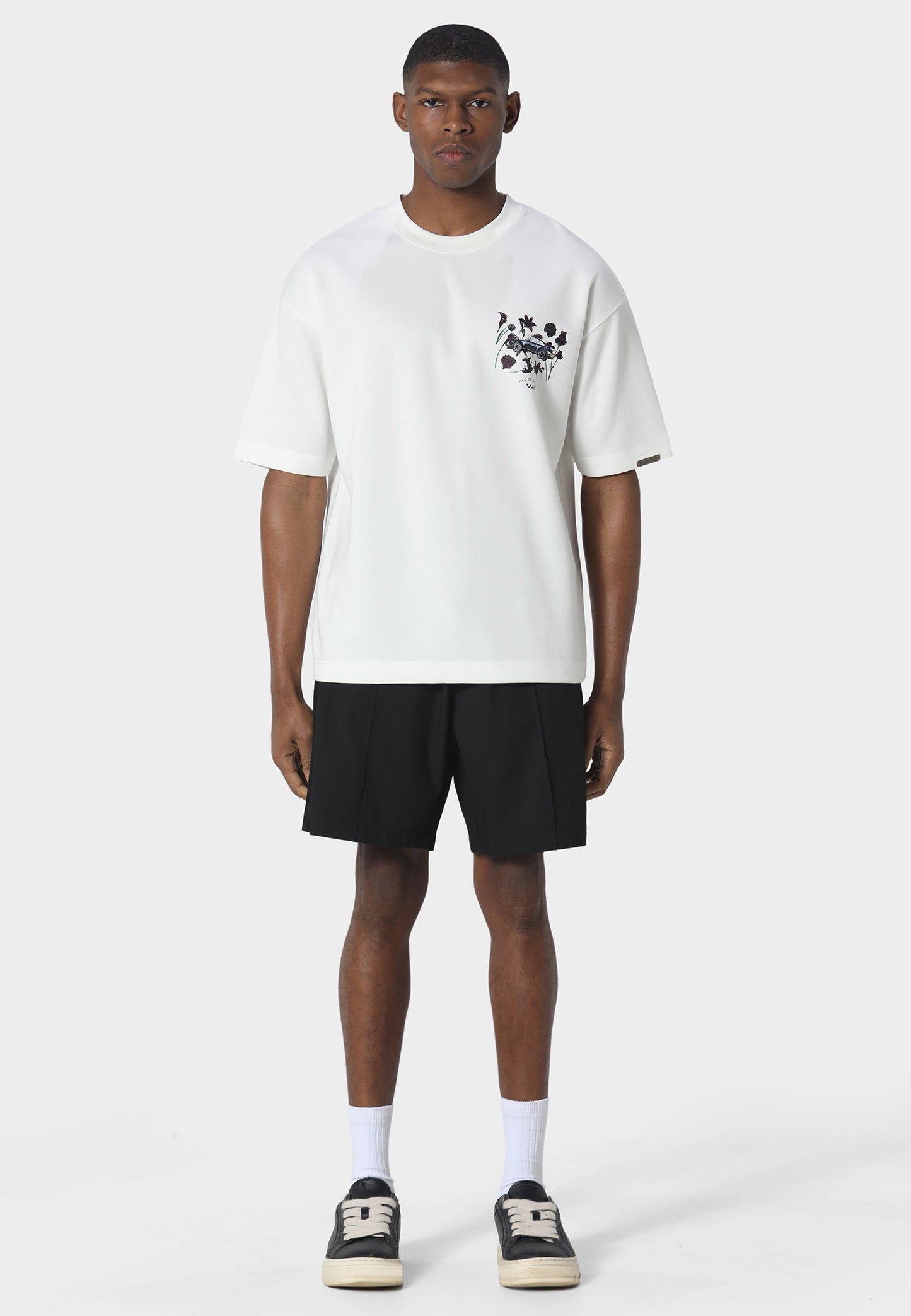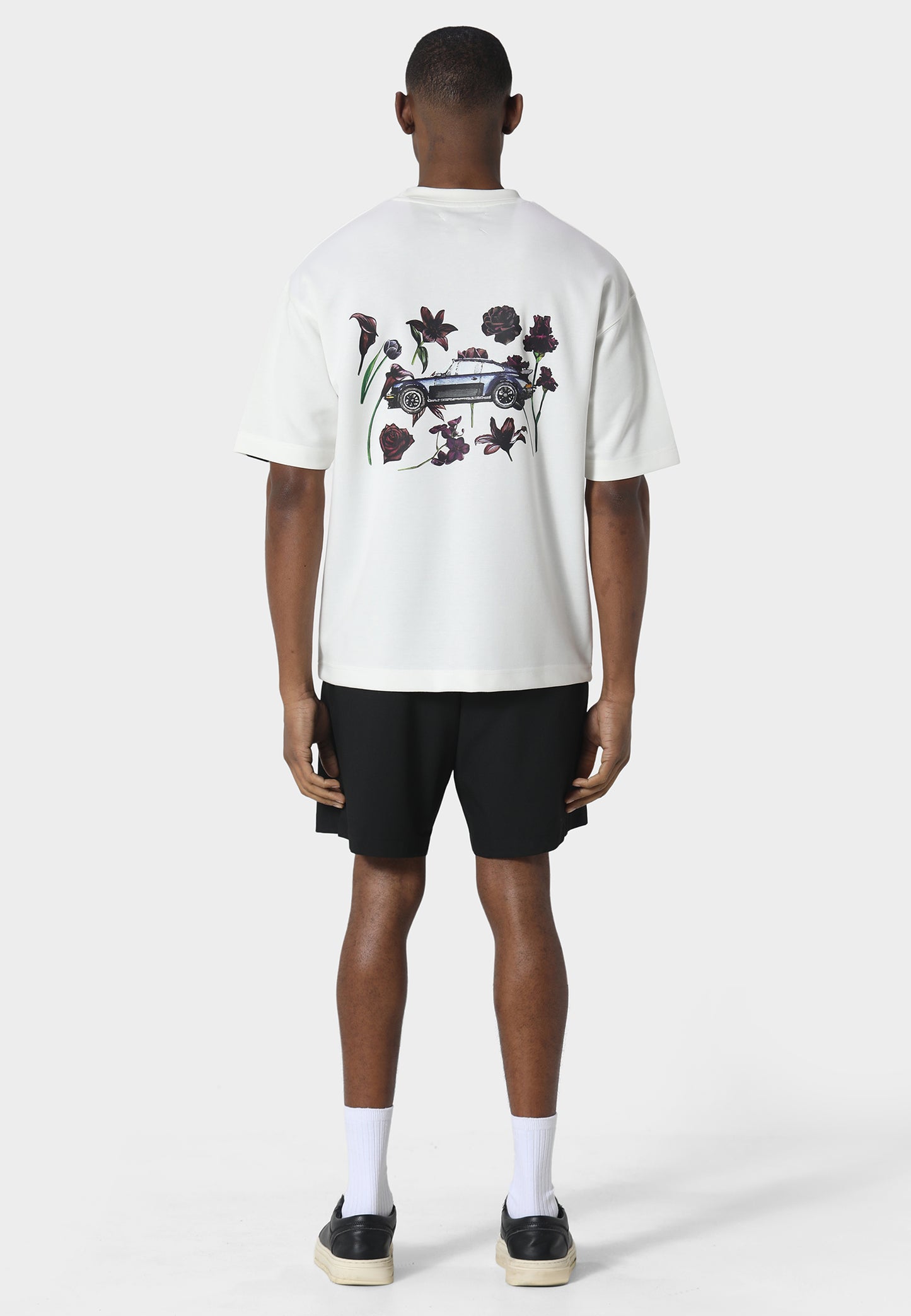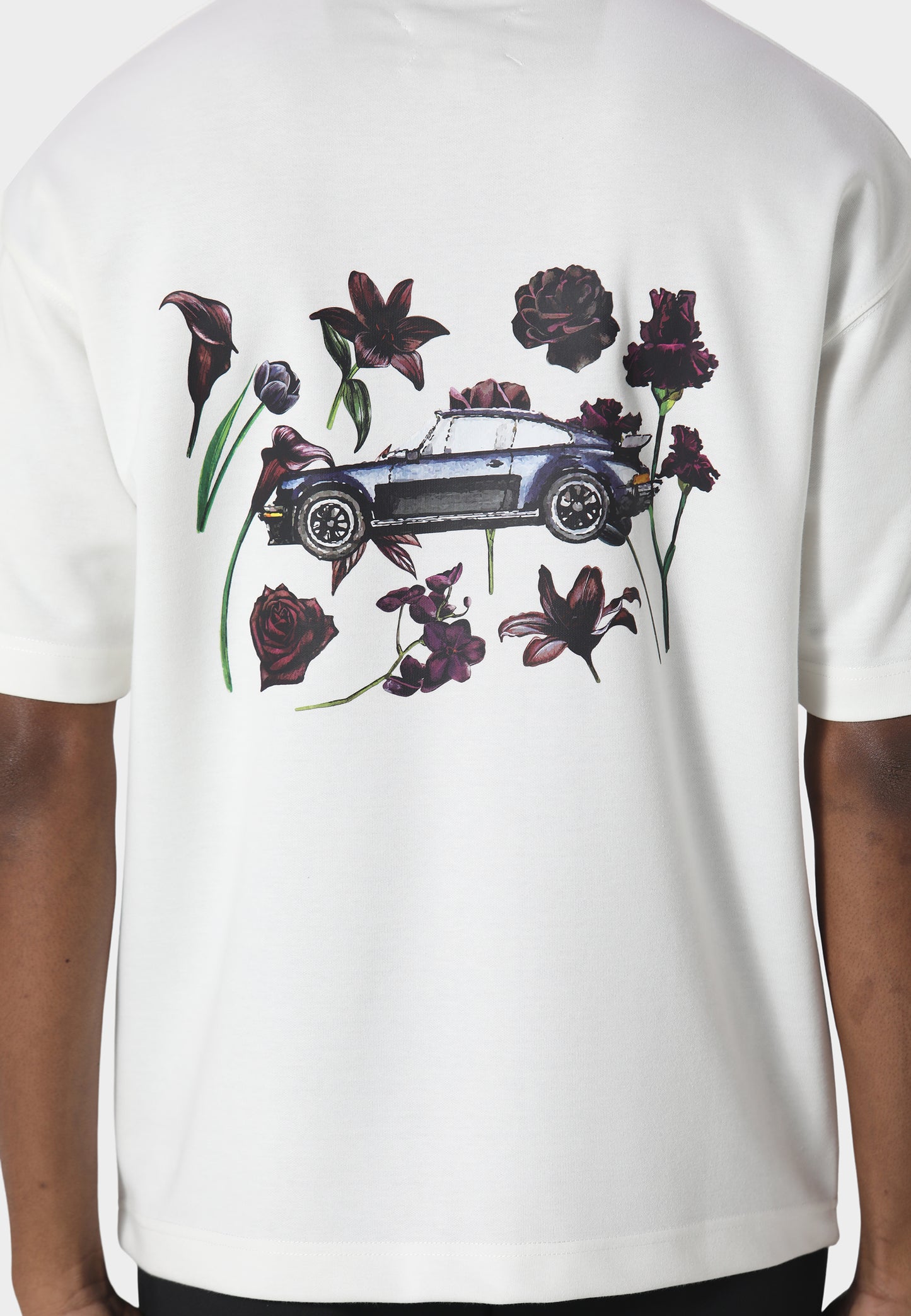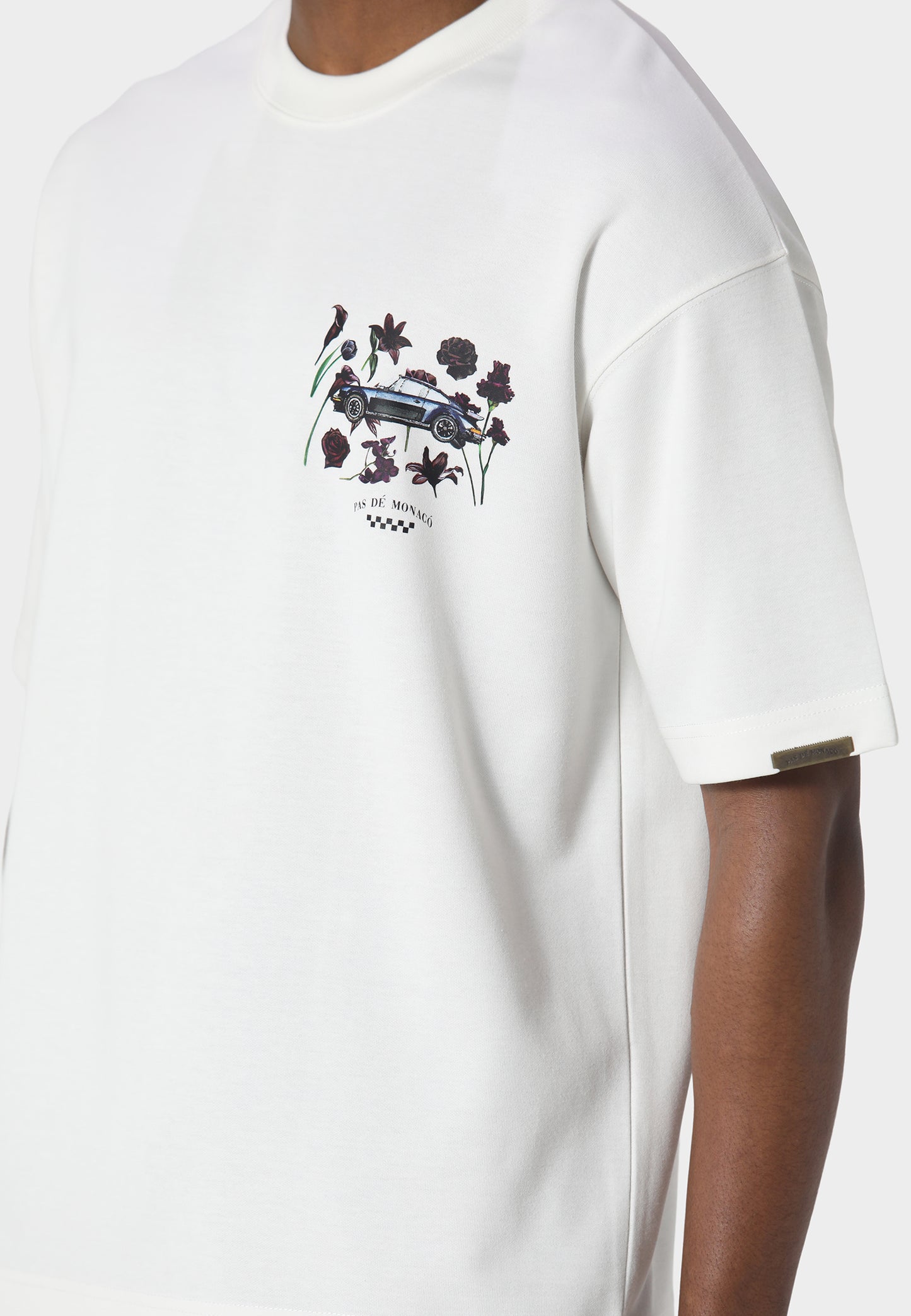A contemporary blend of motorsport and botanical inspiration, the Bloom Torque Off White T-Shirt is cut in an oversized fit and crafted from premium 240 GSM interlock fabric for structure and comfort. It features a screen-printed chest graphic and a larger back print combining floral elements with a classic performance car motif. Finished with Pas De Monaco’s signature metal sleeve badge detail.