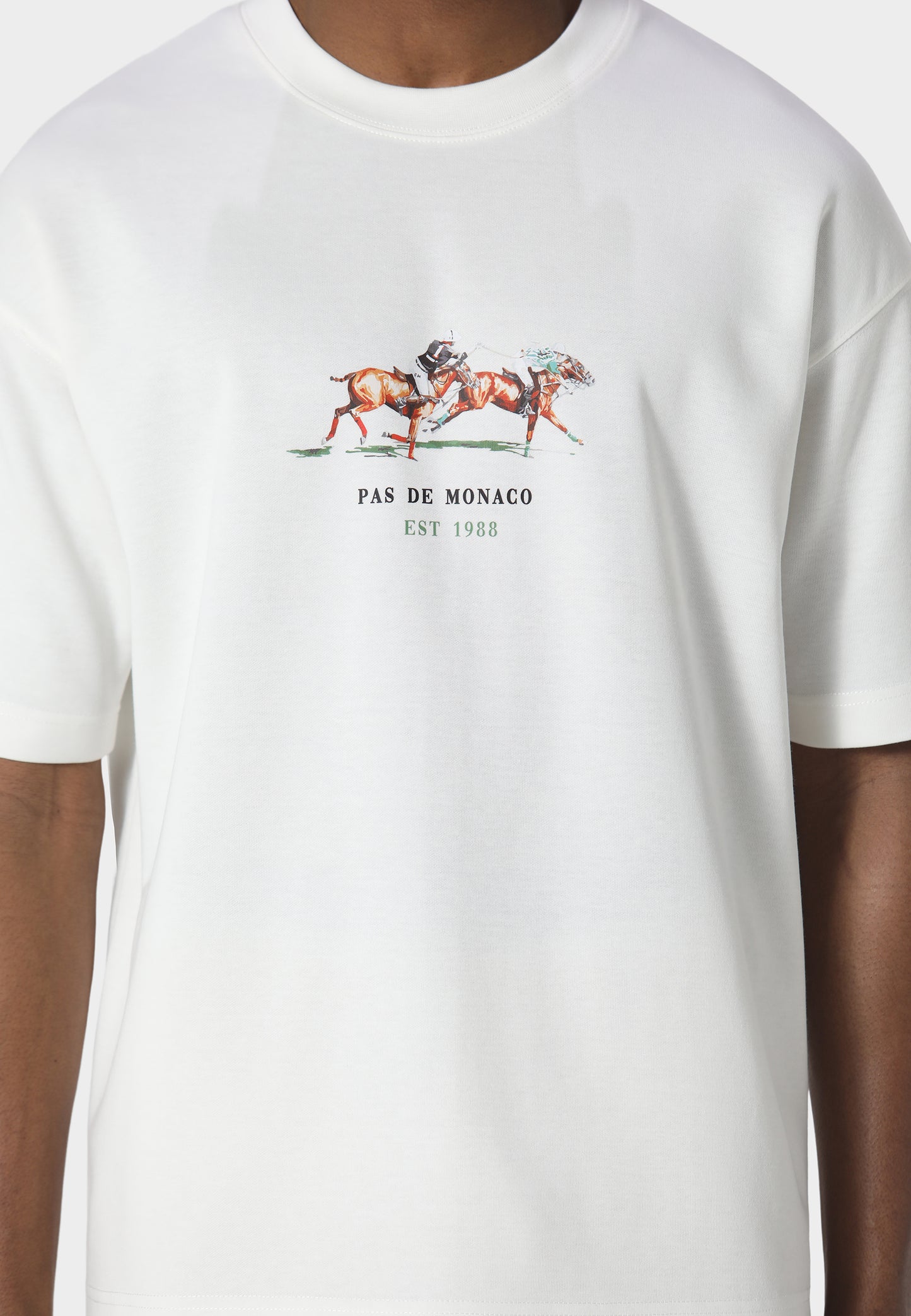 A refined take on statement graphics, the Equestrian Flare T-Shirt is crafted from 240 GSM interlock fabric in a relaxed oversized fit for structure and comfort. The front features a detailed equestrian-inspired DTF print, bringing movement and character to the minimalist silhouette. Finished with Pas De Monaco’s signature metal sleeve badge detail.