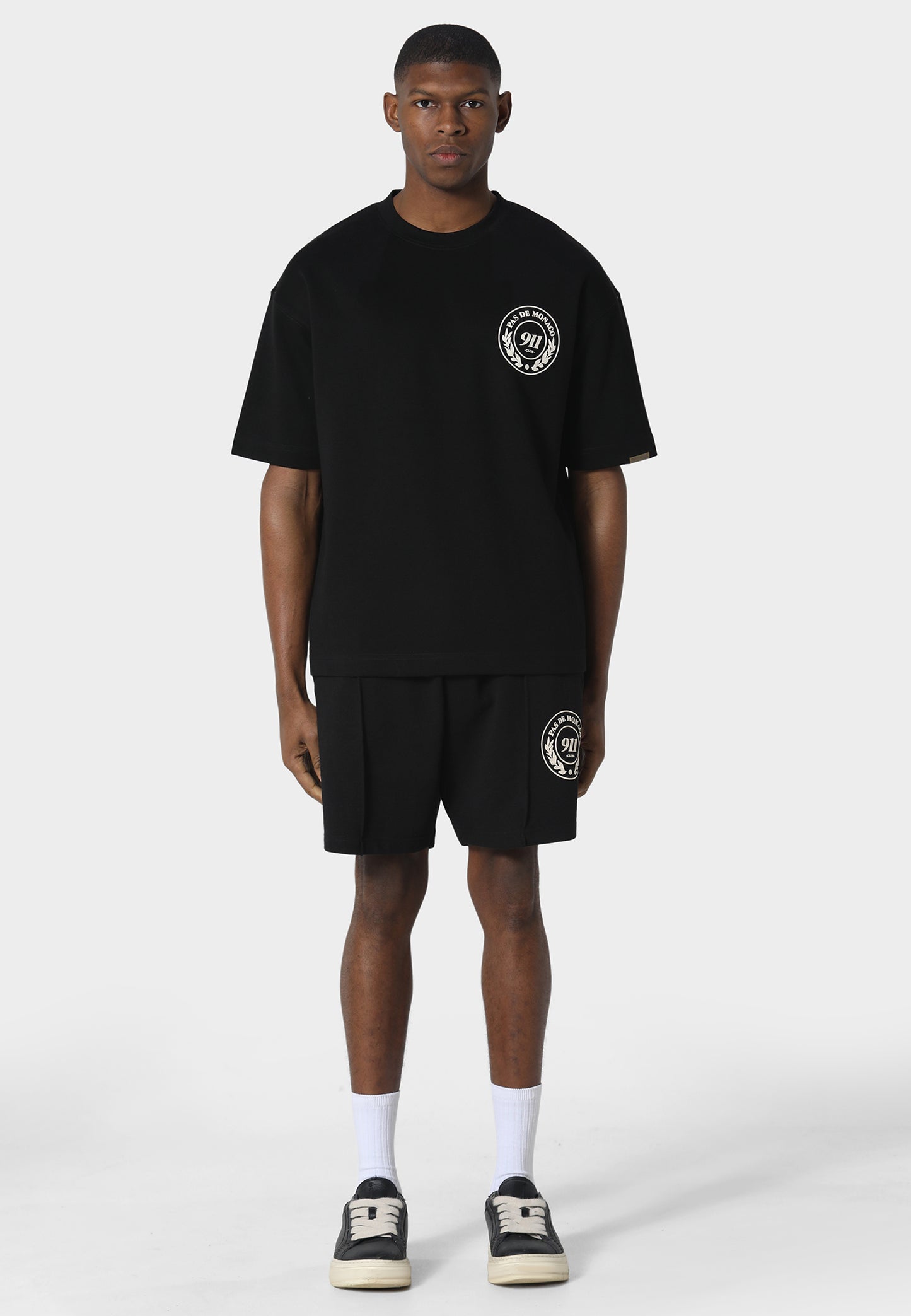 A refined blend of comfort and motorsport-inspired design, the Lemans Black Jog Shorts are cut in a relaxed fit and crafted from heavyweight 450 GSM loopback fabric for structure and durability. Featuring a high-definition silicone crest print on the leg, they pair seamlessly with the Icon 911 T-Shirt or Carrera Line Shirt for a complete look. Finished with side pockets, adjustable drawstrings, pin tuck detailing, and the signature Pas De Monaco metal badge on the rear pocket.