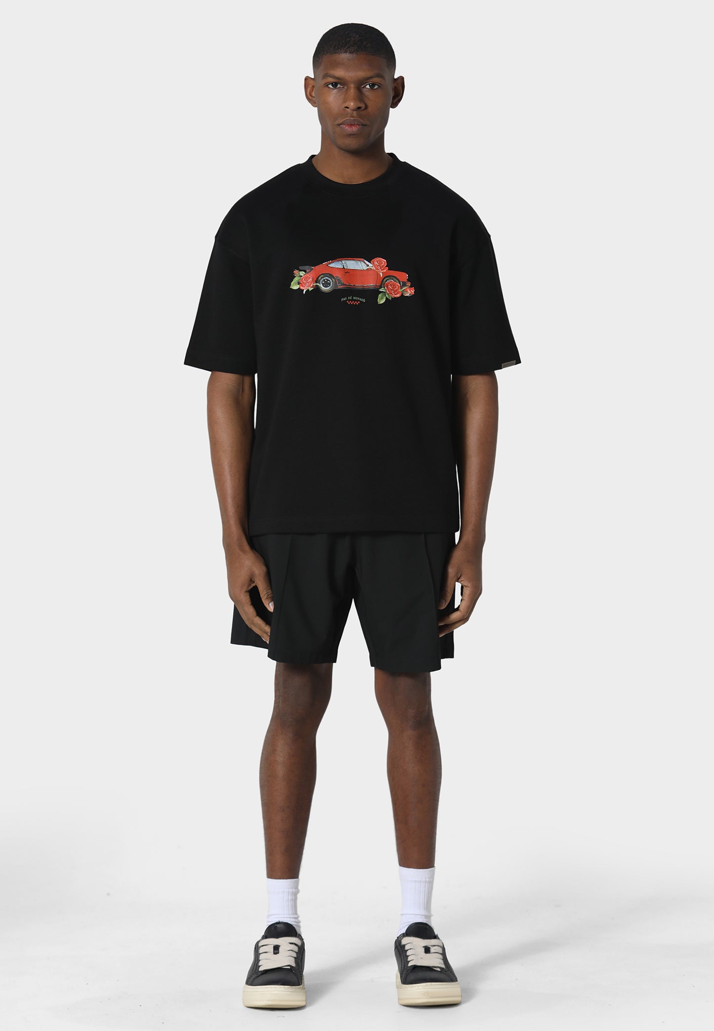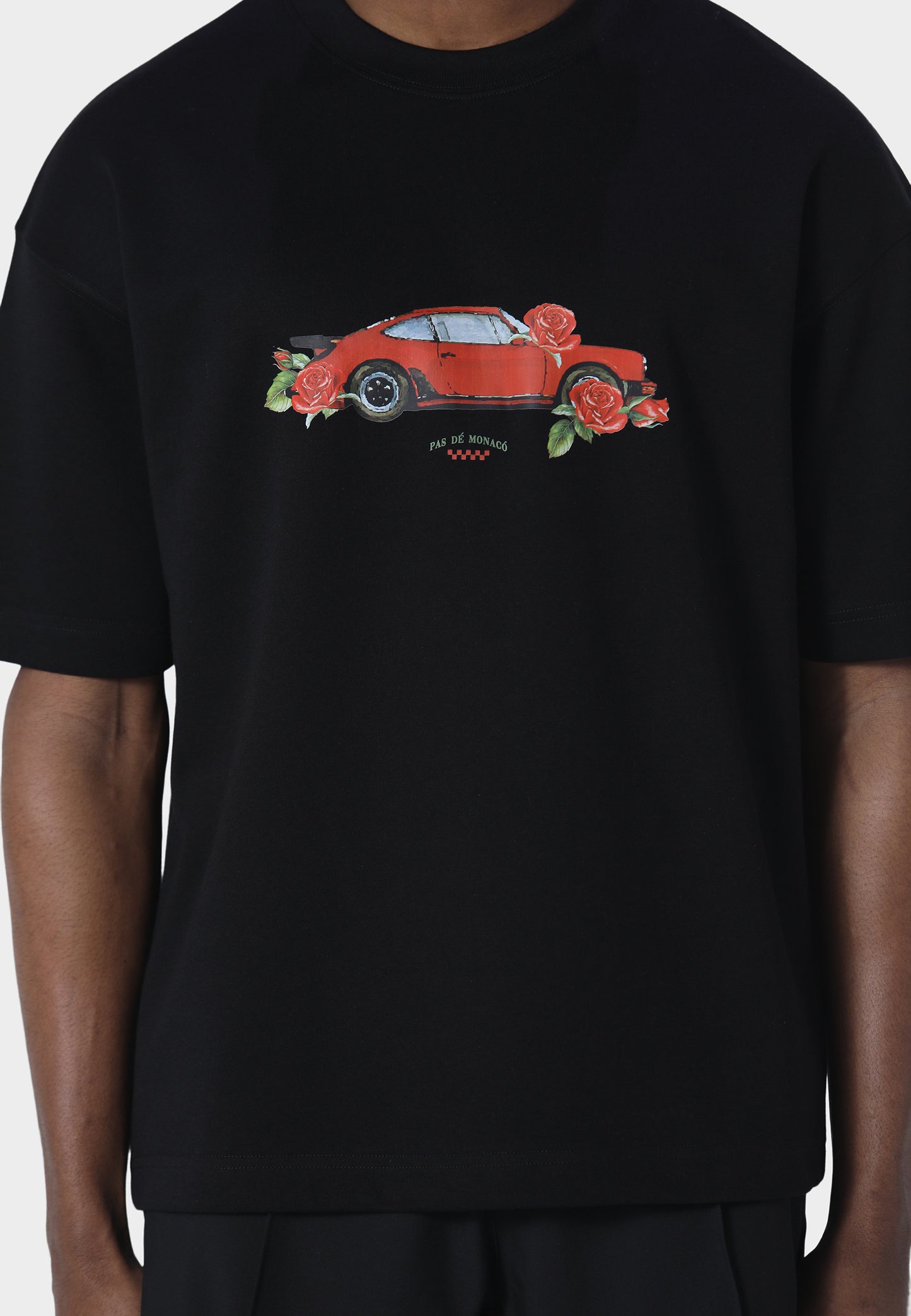 A motorsport-inspired staple, the Monoposto Black T-Shirt is cut in an oversized fit and crafted from 240 GSM interlock fabric for a structured yet comfortable feel. It features a detailed screen-printed graphic of a classic sports car accented with subtle floral elements, blending racing heritage with a refined design touch. Finished with Pas De Monaco’s signature metal sleeve badge detail, it delivers a clean everyday silhouette with a distinctive edge.