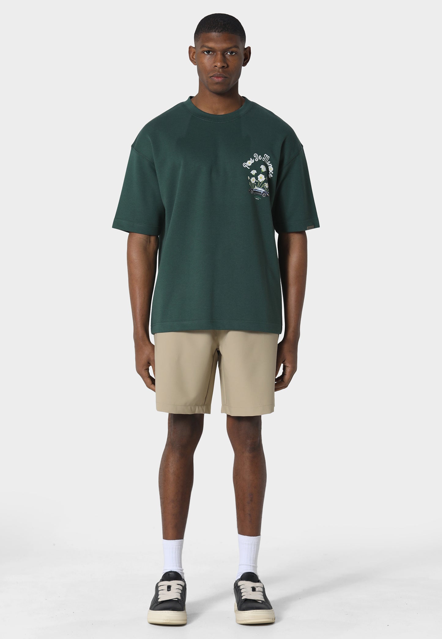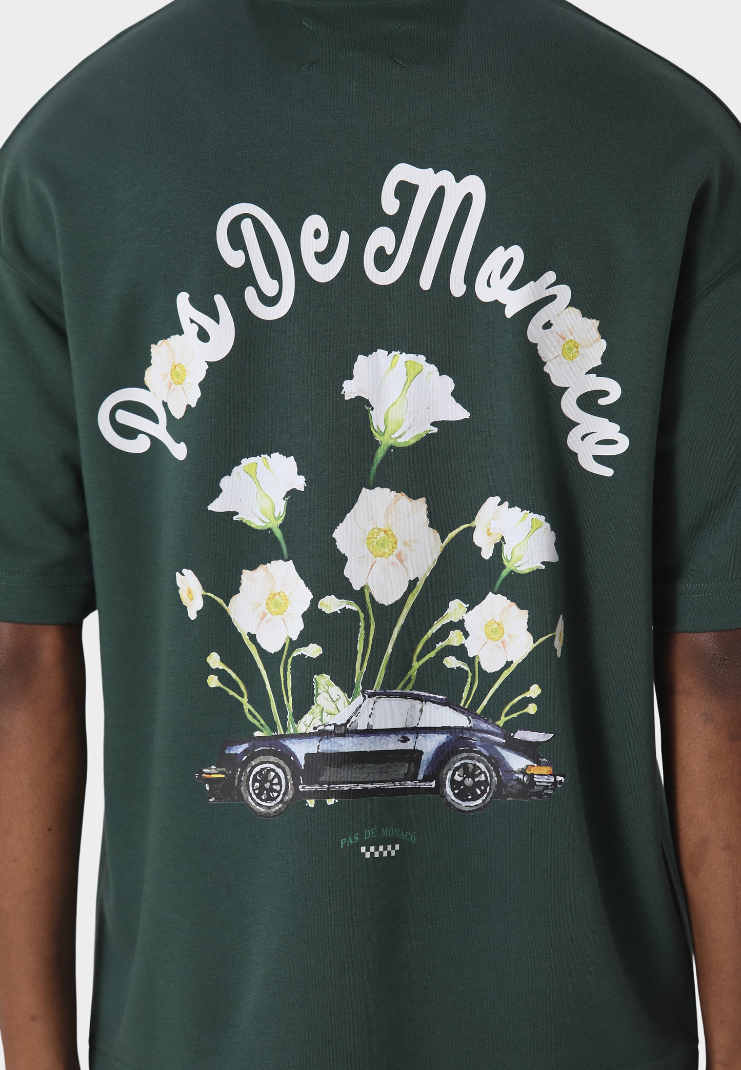The Pink Reverie Pedosa Green T-Shirt reflects a balance of artistry and refinement. Crafted from 240 GSM interlock fabric, the oversized silhouette offers a structured yet effortless drape. A screen-printed graphic features delicate florals and a classic car motif, creating a distinctive visual story across the front and back. Finished with Pas De Monaco’s signature metal sleeve badge detail.