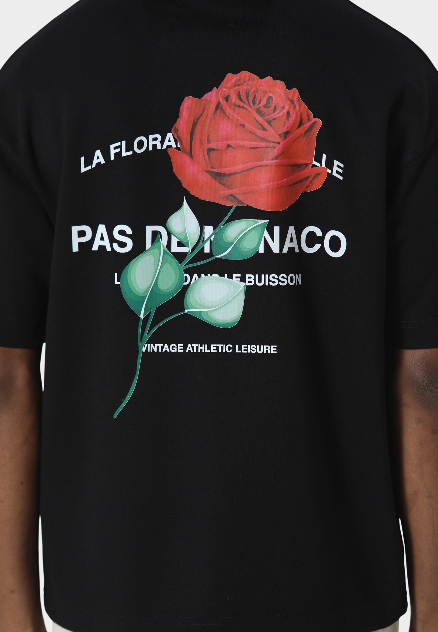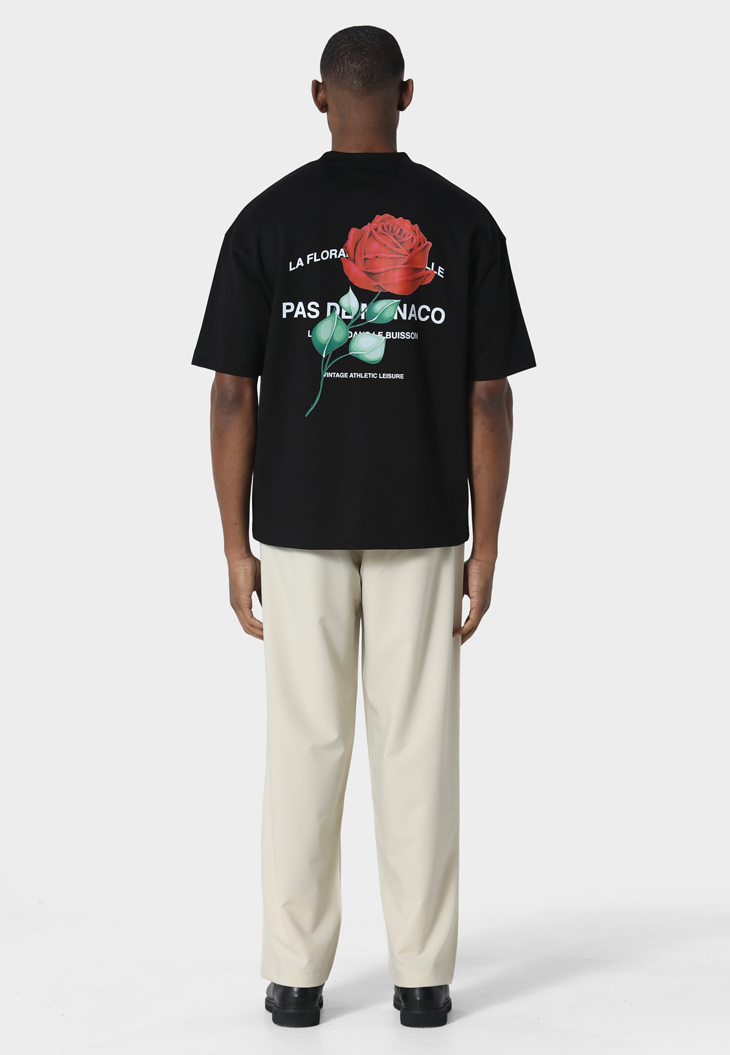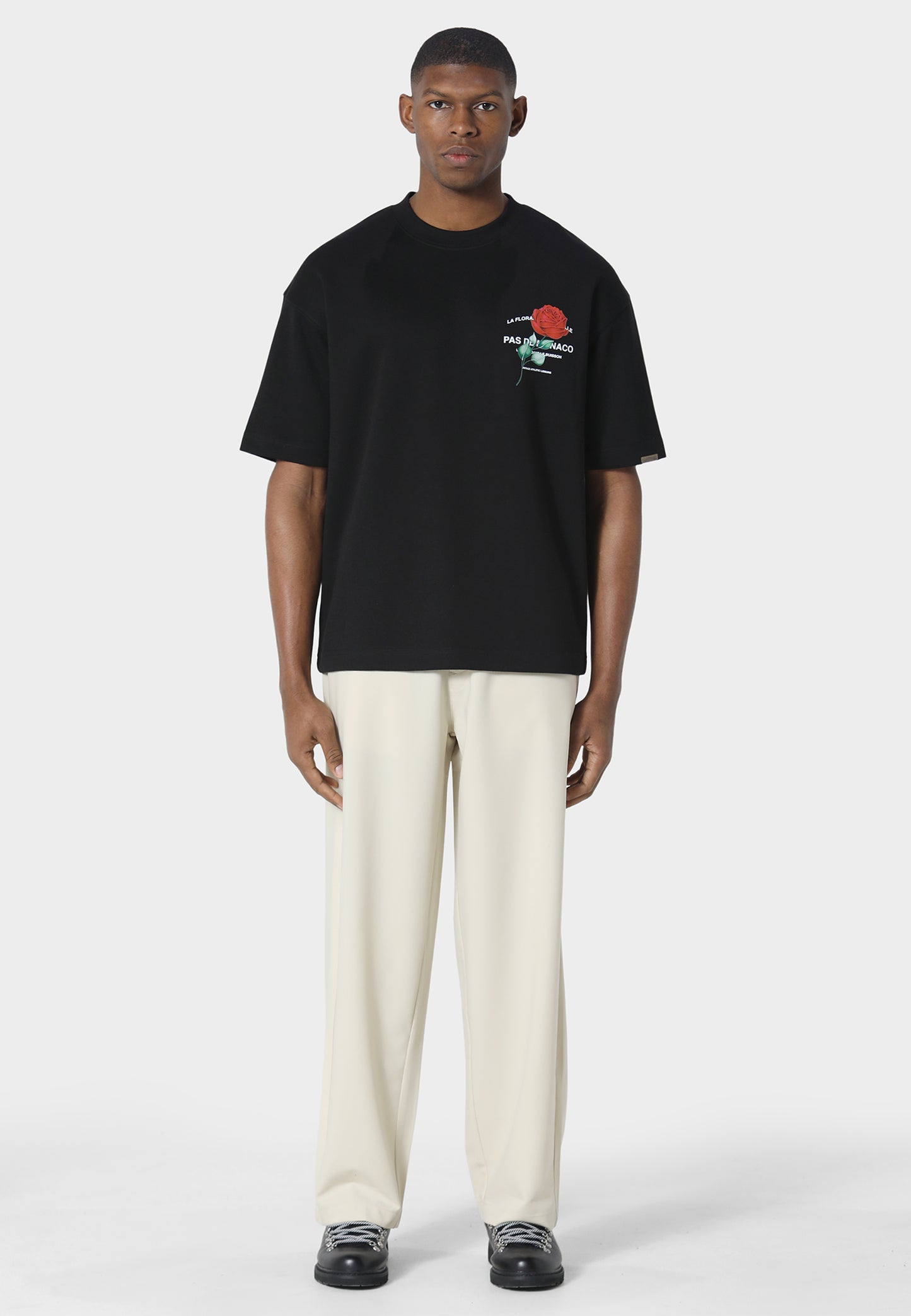 The Rose Riviera Black T-Shirt captures a blend of elegance and contemporary design. Crafted from 240 GSM interlock fabric, the oversized silhouette offers a smooth, structured drape. The striking rose motif screen printed graphic creates a bold visual statement across the front and back. Finished with Pas De Monaco’s signature metal sleeve badge detail.